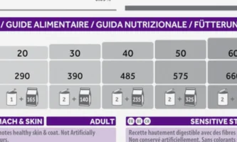 On the back of all pet food packaging are feeding guidelines that outline how much food is needed for your pet based on their weight. Brands with wet and dry formulas tend to display mixed-feeding guidelines on the back of their food, such as: